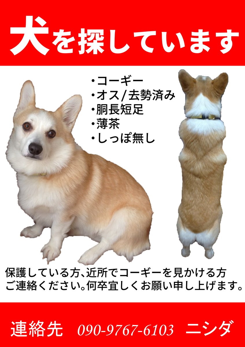 コーギー探してます 富山県 富山県で犬 を探しています どこかで飼われている可能性が高いです 飼い主様に懐いて堂々と散歩していてもレンの可能性もあります 胴長短足 顔は白っぽい 薄茶色 尻尾のない犬 コーギー をお見かけしたらご連絡ください